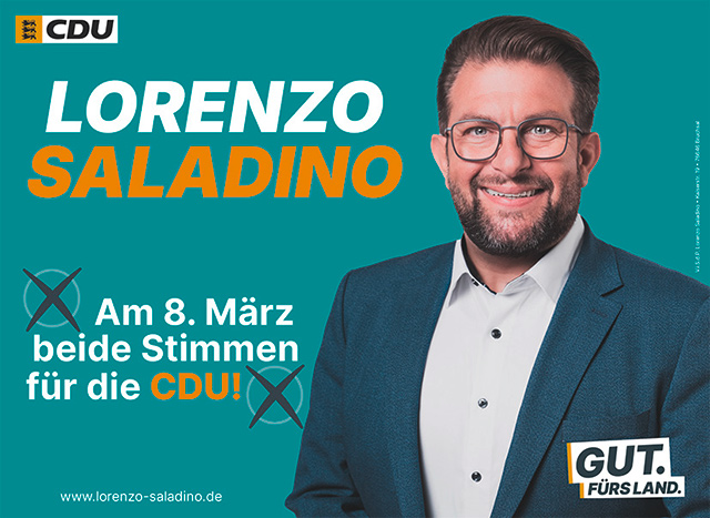 Am Samstag, den 21. Februar 2026 findet ein Informationsstand zur Landtagswahl unserem CDU Kandidaten Lorenzo Saladino statt. Beginn um 8.oo Uhr. Hierzu sind alle Mitbürgerinnen und Mitbürger sehr herzlich eingeladen um mit Lorenzo Saladino persönlich ins Gespräch zu kommen. Das Motto unseres Kandidaten ist „Einer von uns“, was heißt, dass die Menschen im Wahlkreis Mittelpunkt seiner politischen Arbeit sind.